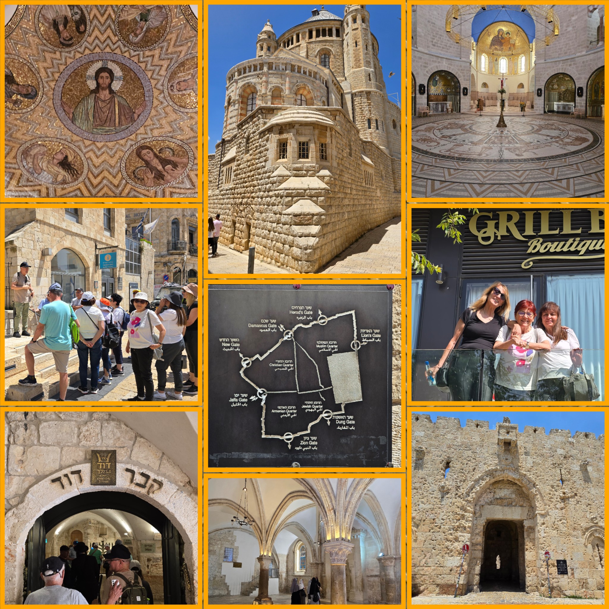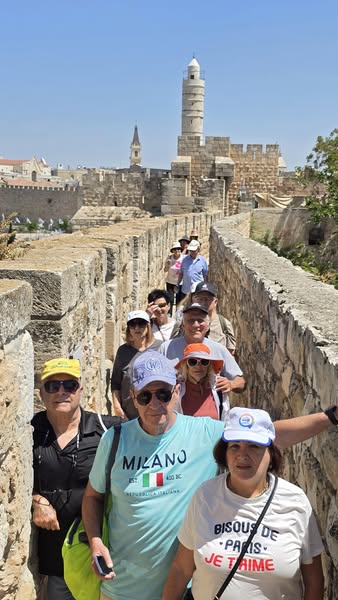 התחנה הראשונה שלנו הייתה בשער יפו, שם עצרנו ליד הקברים של שני האדריכלים שבנו את חומת ירושלים עבור הסולטן סולימאן המפואר. עלינו על החומה והלכנו עליה עד שער ציון, כשמתחתינו הרובע הארמני (בתוך החומה) ומולנו פארק טדי, משכנות שאננים ועוד רבים מאתרי ירושלים המערבית. מול קטע החומה הדרומי ראינו את הר ציון ושמענו מטוביה על הר ציון, למה ערף הסולטן את ראשי הארכיטקטים שלו ועל ההיסטוריה של כנסיית הדורמיציון ומגדל הפעמונים המיוחד שלה, שמנציח את דמותו של הקיסר וילהלם עם הקסדה והשעונים.