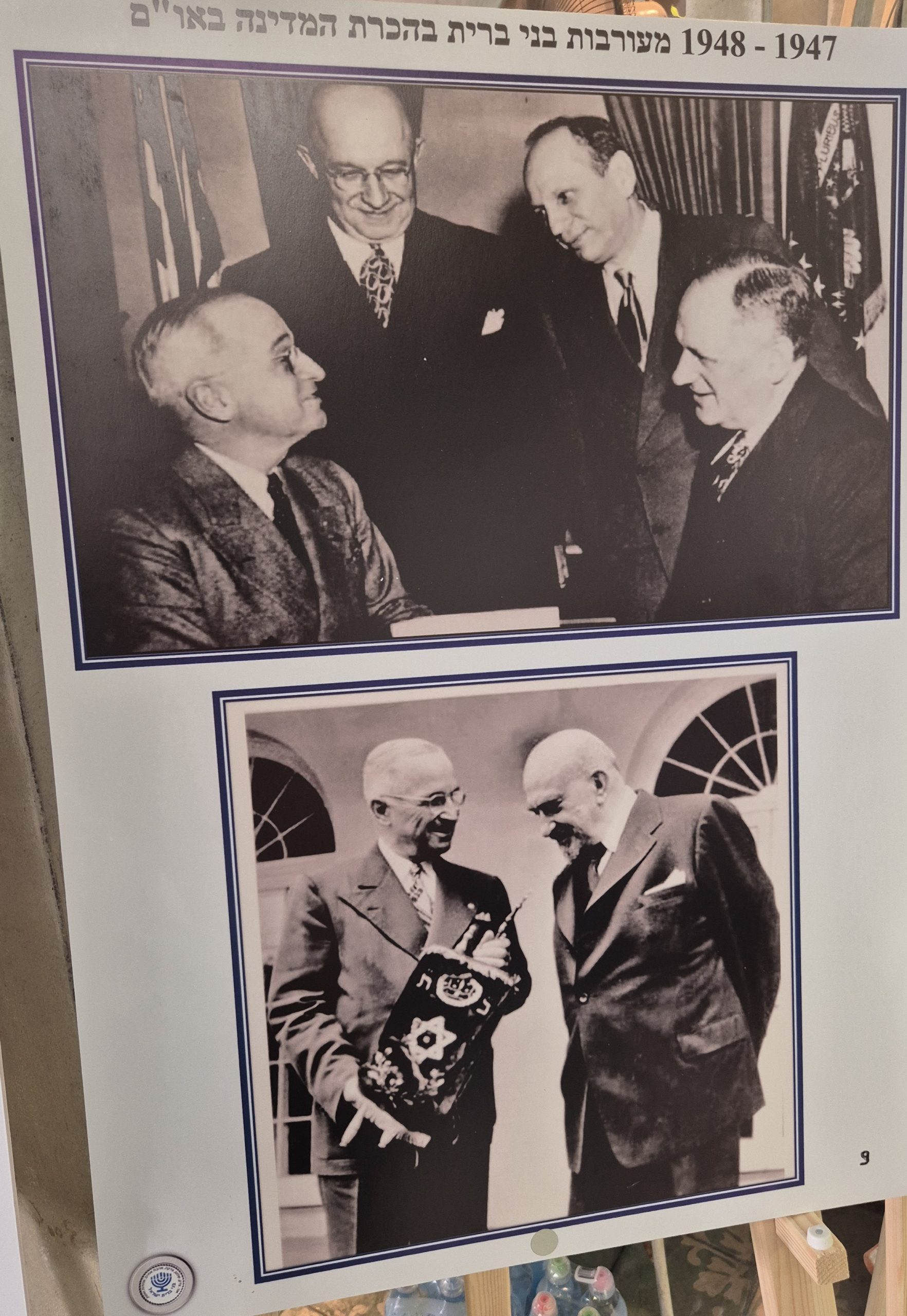 The exhibition includes 24 posters , designed from archival materials, and follows the history of B’nai B’rith Israel, its contribution to building the Yishuv and developing the State, and its present-day growth and rejuvenation. One poster is dedicated to the founding of B’nai B’rith in New York 182 years ago , and another to President Harry S. Truman famous meeting with leaders of B’nai B’rith (including Eddie Jacobson and Frank Goldman), who made the case for U.S. support for the creation of a Jewish state. Some of the archival materials have been enhanced using AI.